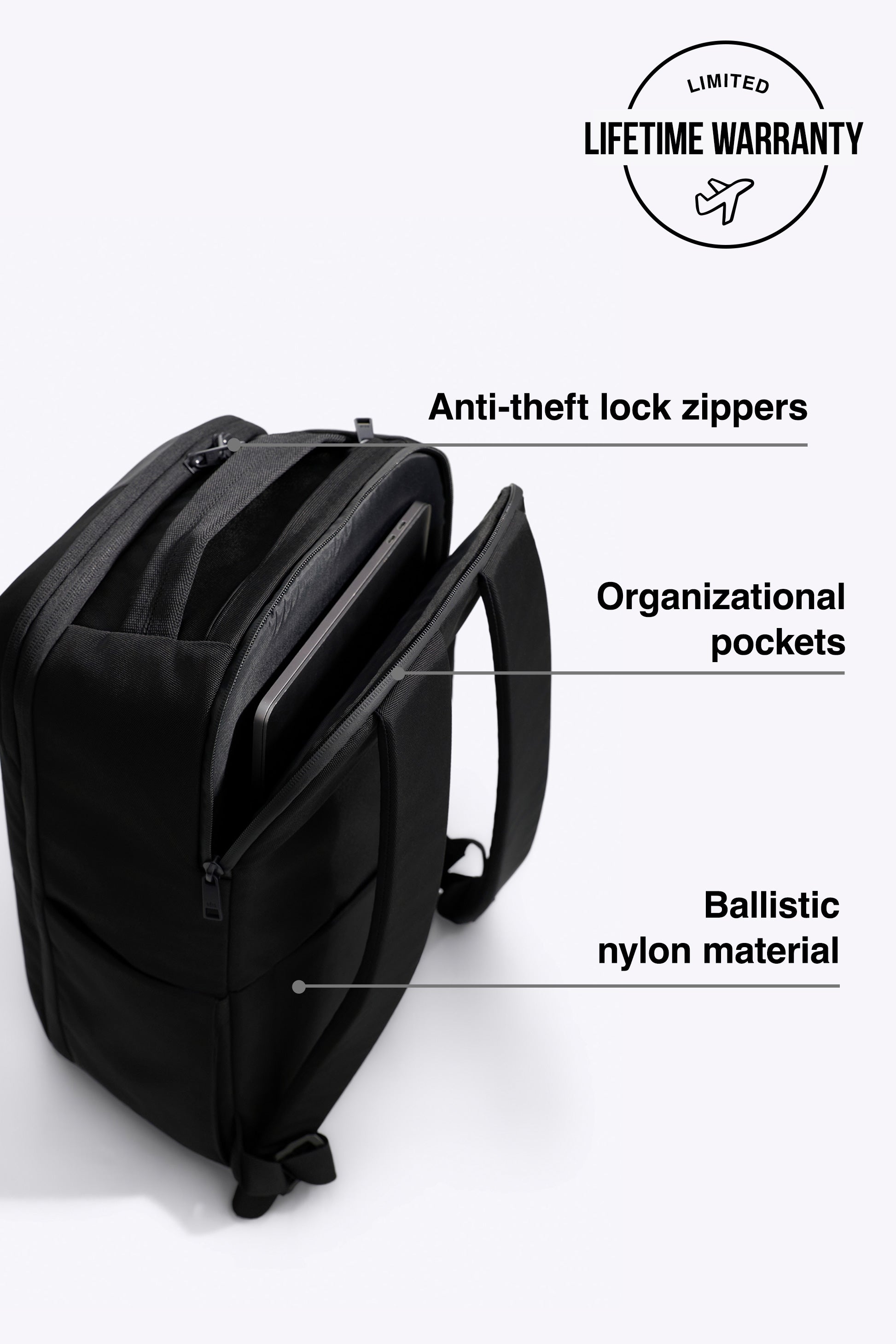 - Security zippers to help deter unwanted access in crowded spaces