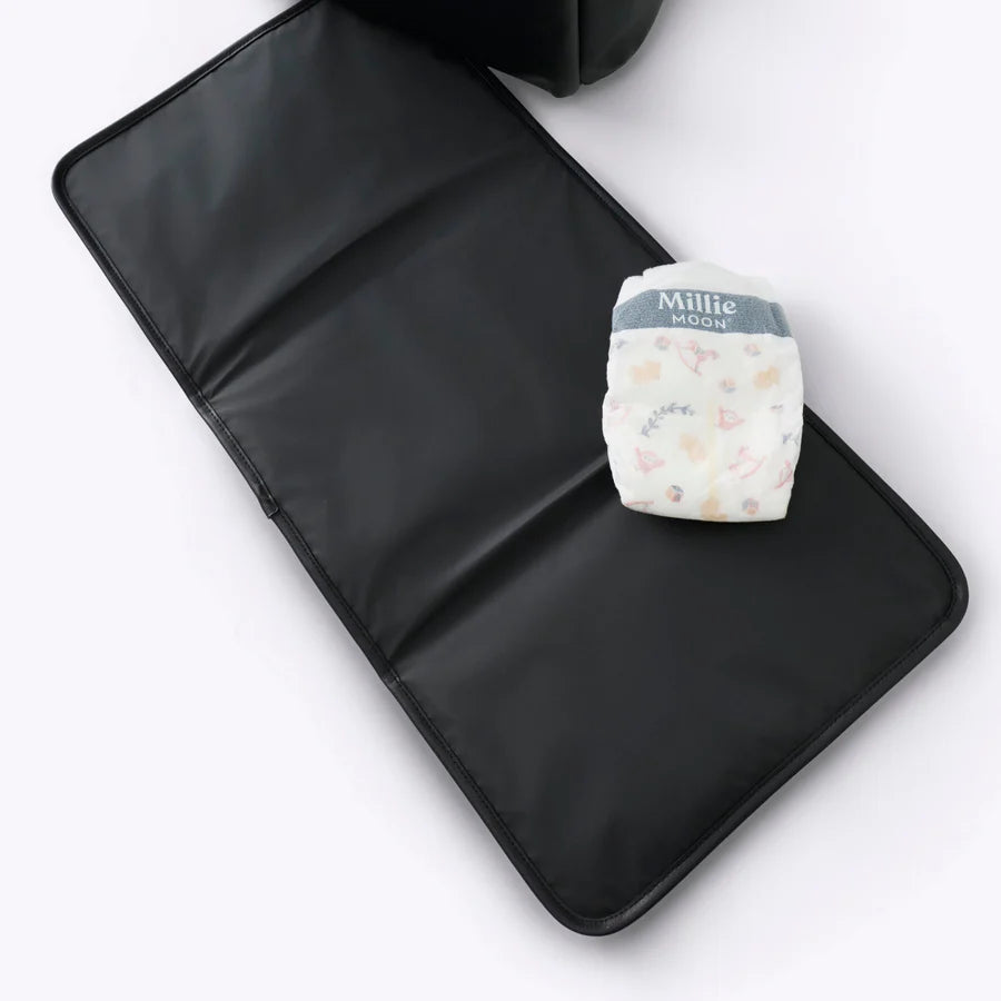 Comes with wipeable changing pad with pleated zippered pocket.