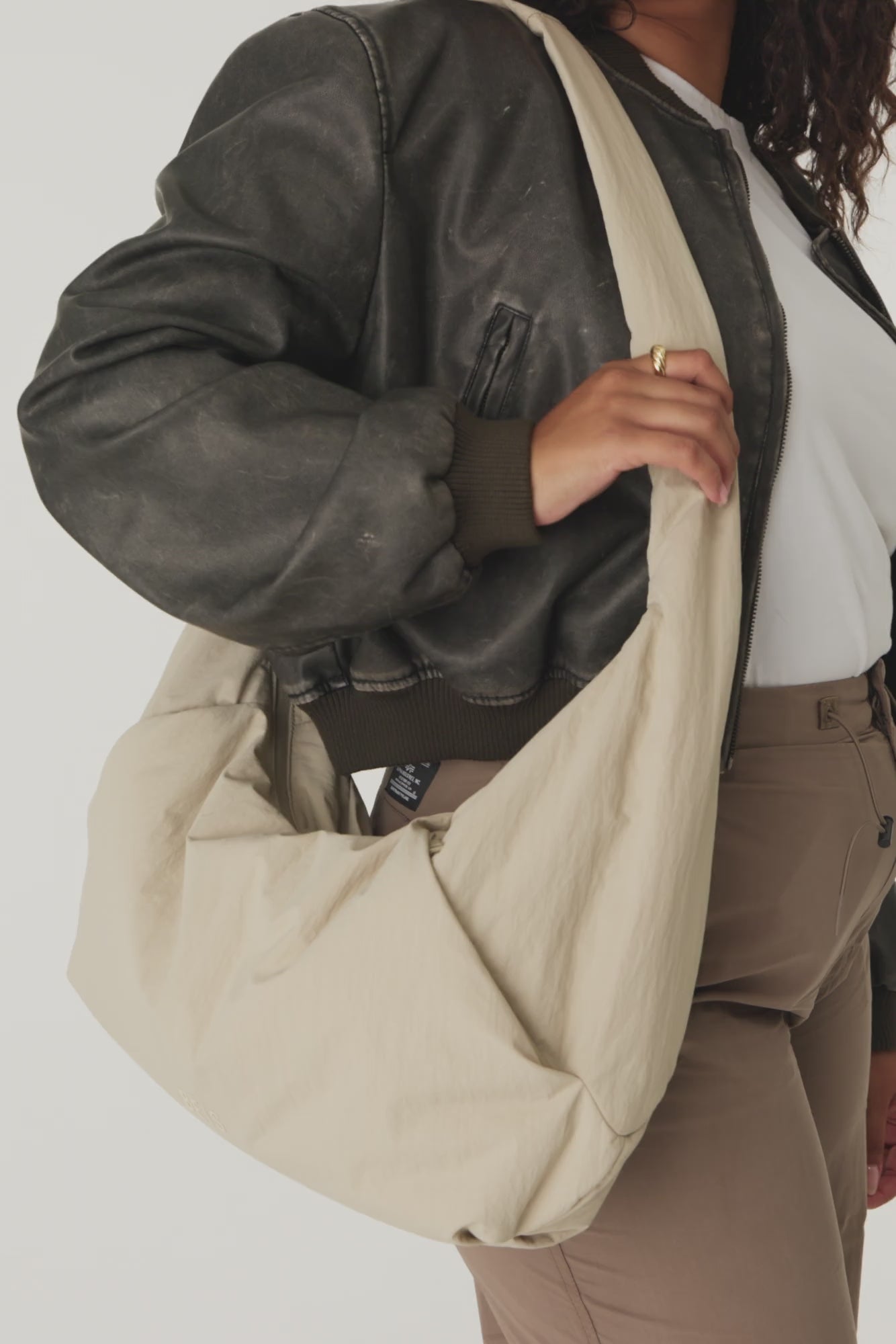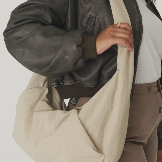 The Oversized Crescent Catchall blends form-fitting comfort with everything-fitting capacity. This roomy crescent-shaped crossbody is crafted in soft puffy nylon with an unstructured silhouette that adapts to your body while holding all your essentials. The adjustable strap lets you wear it as a relaxed crossbody or cinched up over the shoulder—however your day demands.