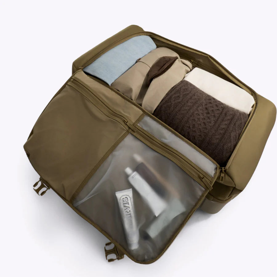 Opens flat for easy access with a zip away divider that lets you pack one large compartment or two separate sections.